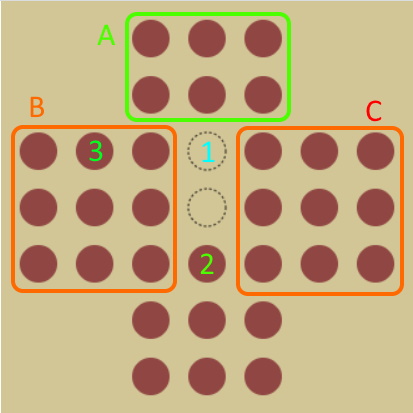 最初に,ペグ1を穴の位置2に移動すると,領域 A, B, C の区分が見える。